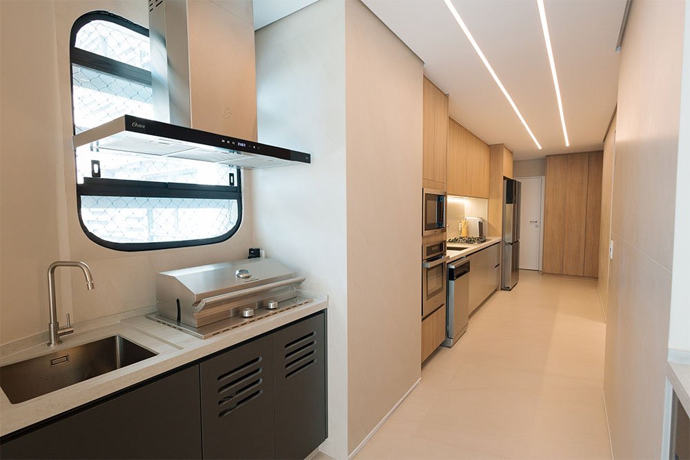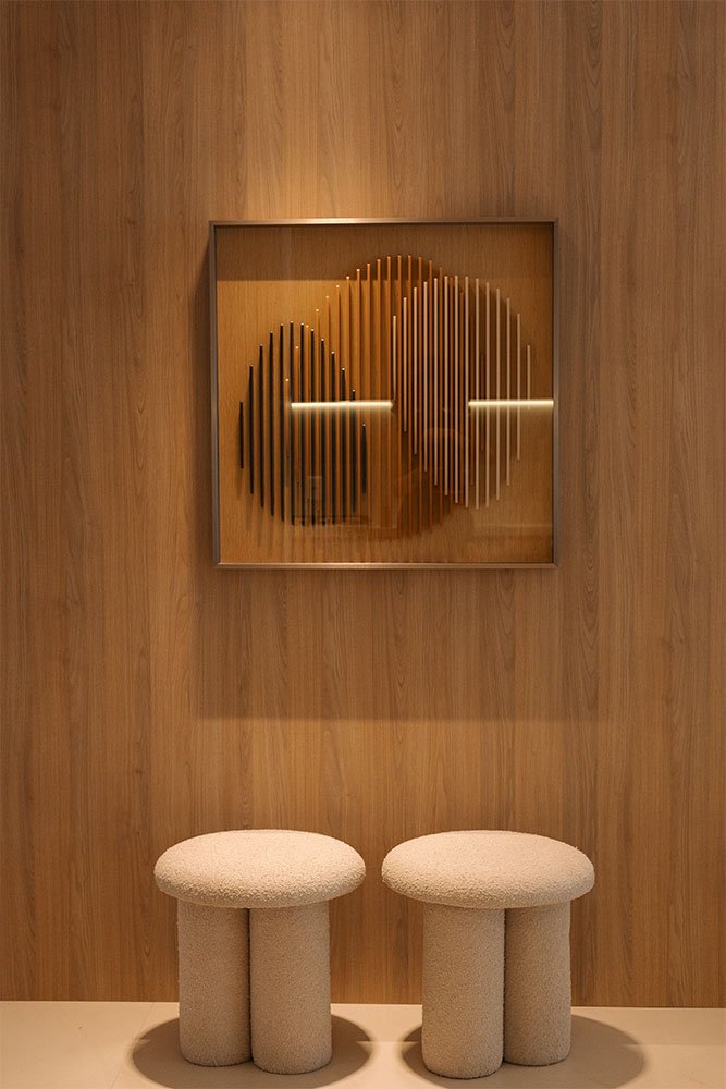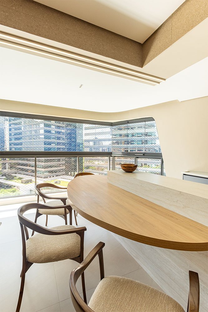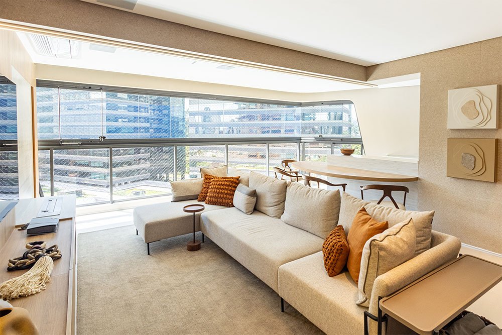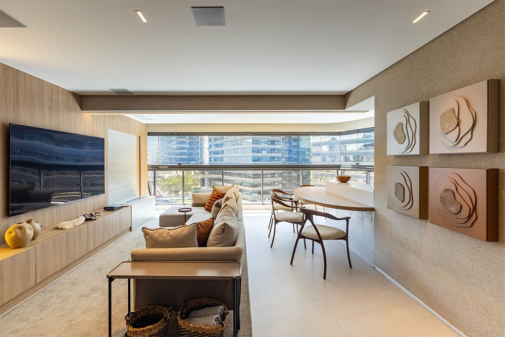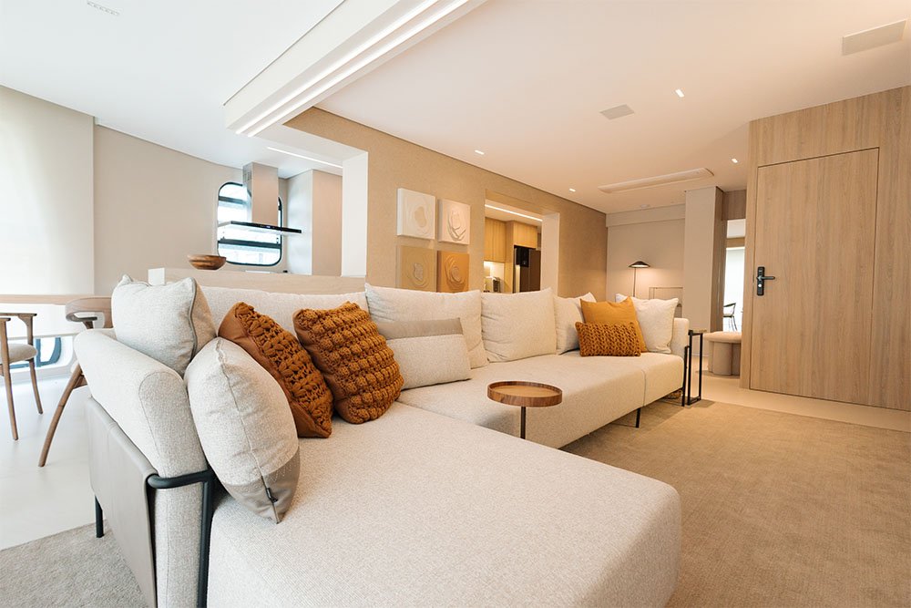 Neste apartamento, o ponto de partida foi o desejo do cliente por ambientes de convivência claros e clean, criando uma atmosfera leve, iluminada e acolhedora.