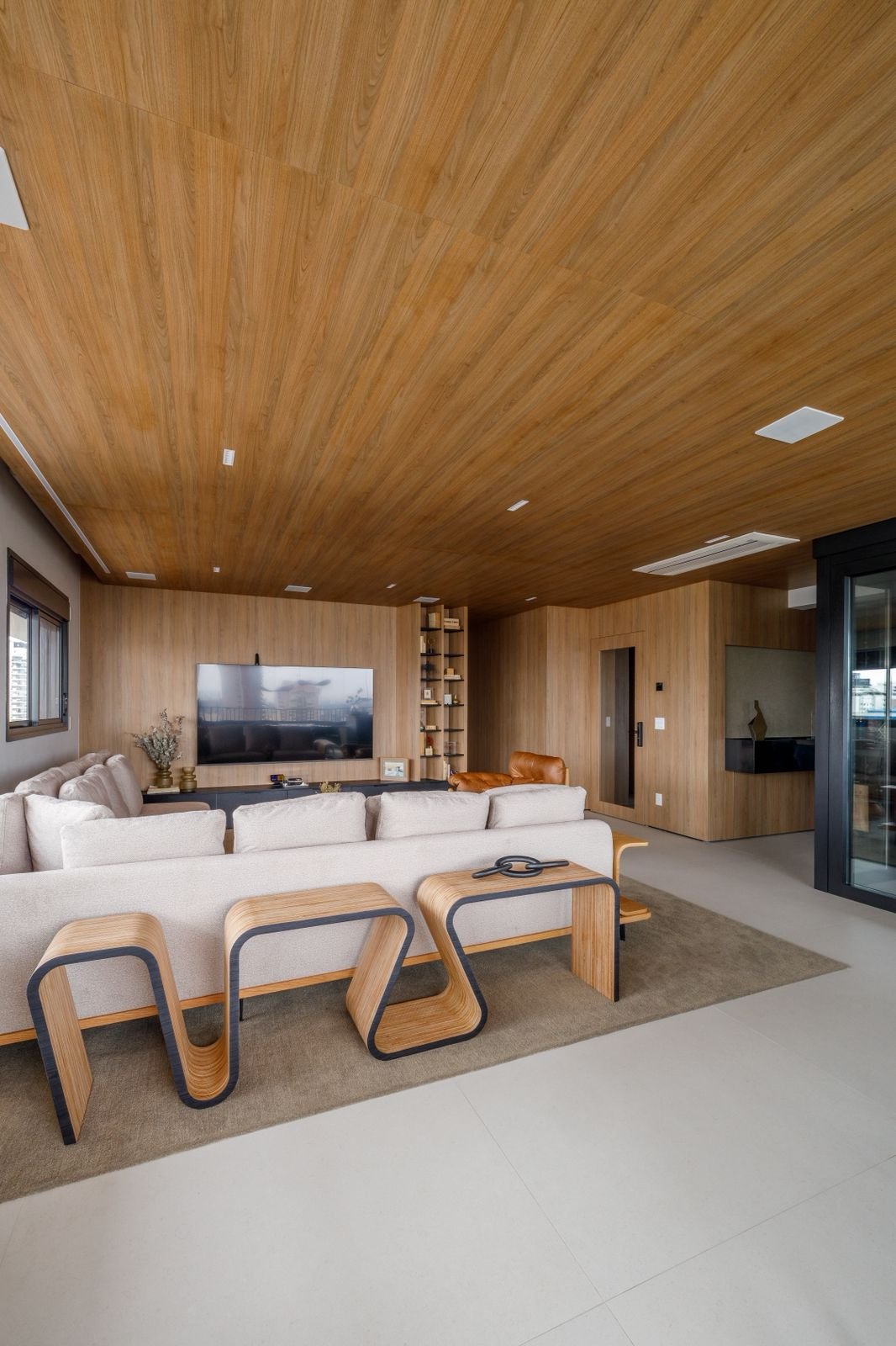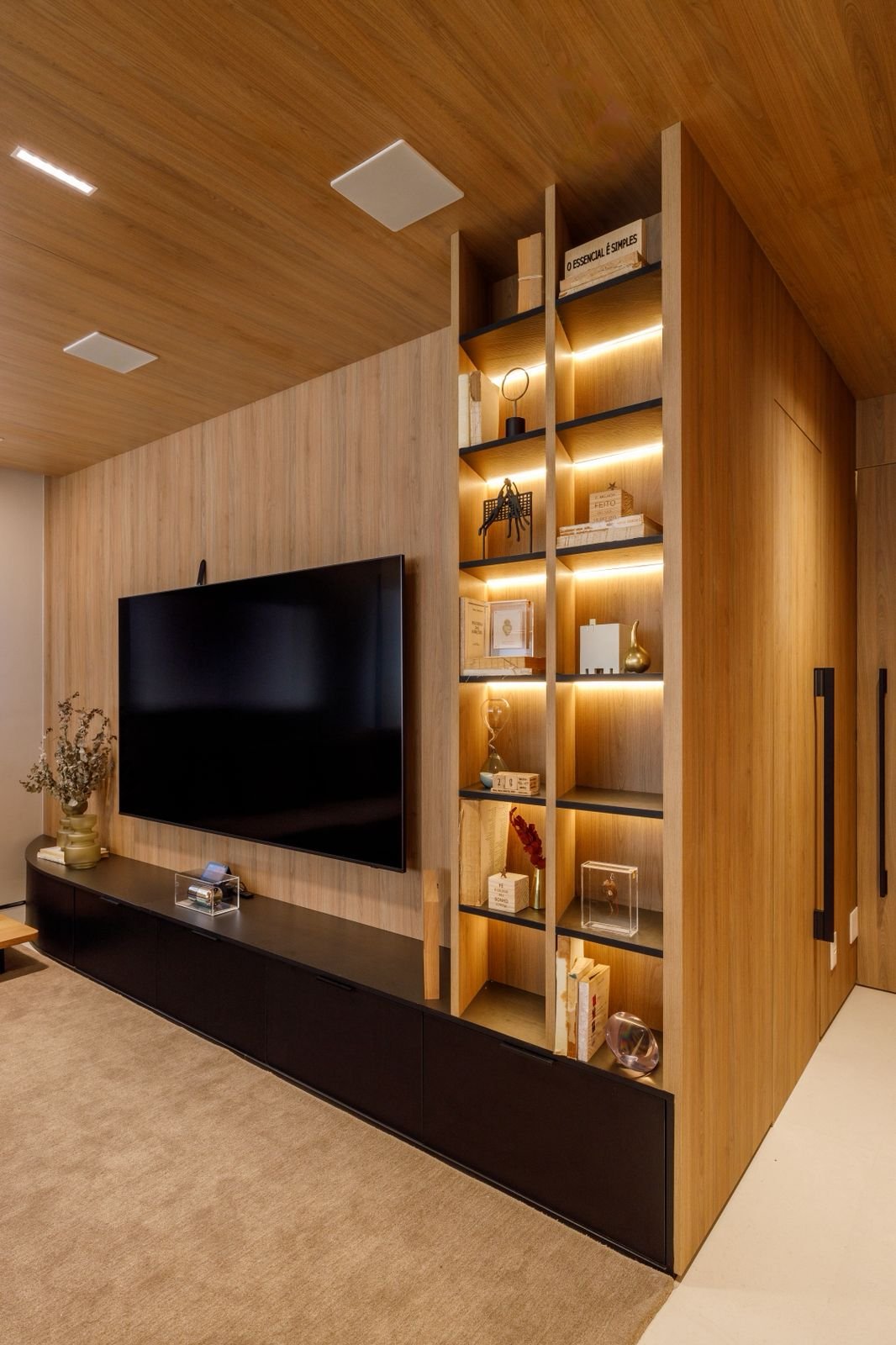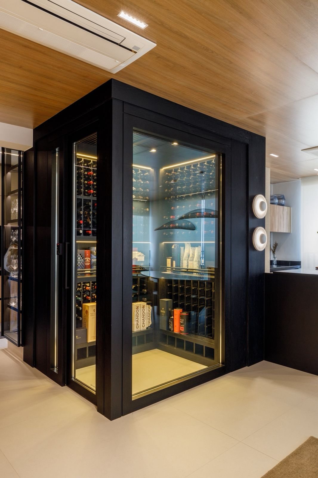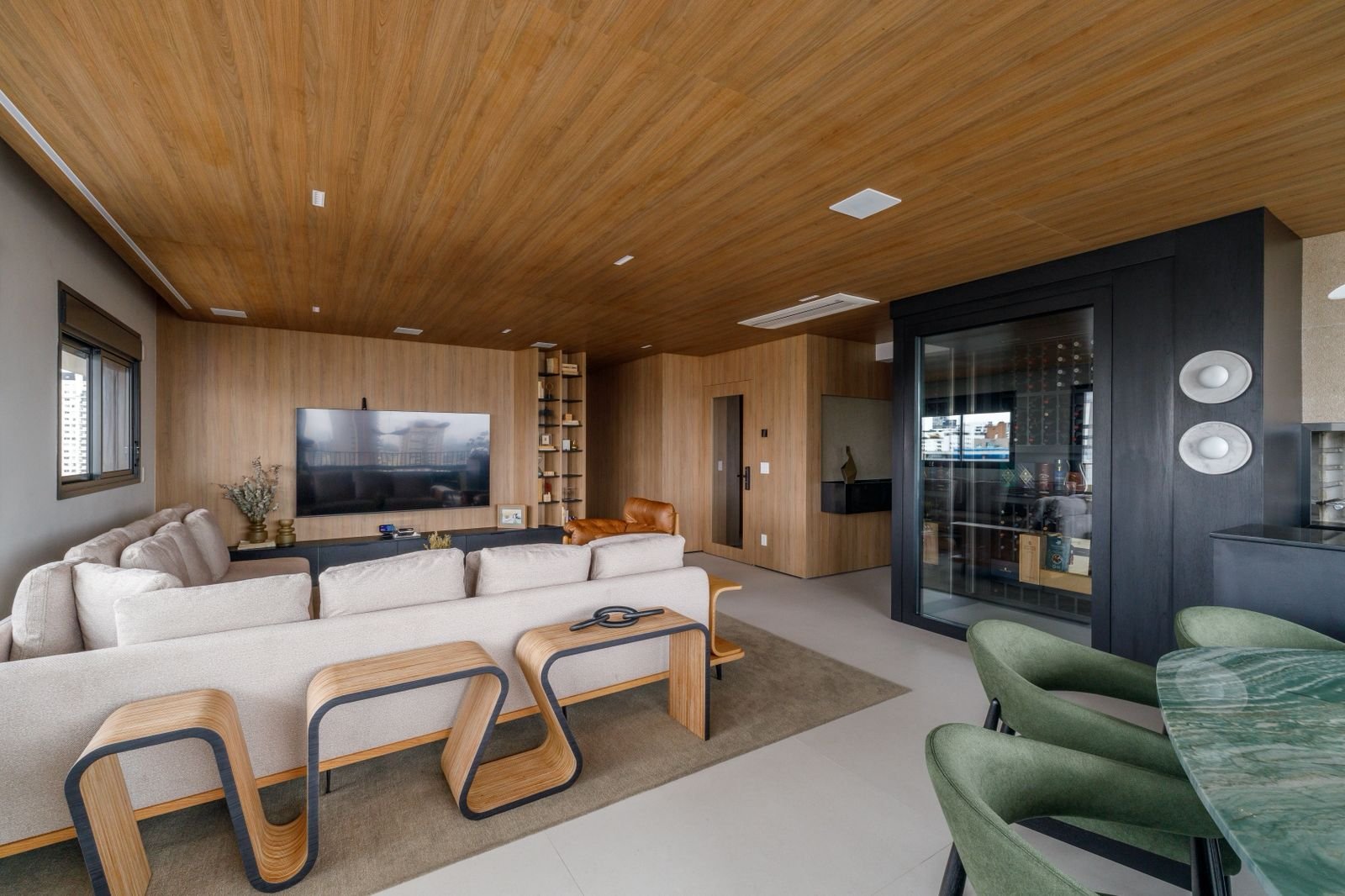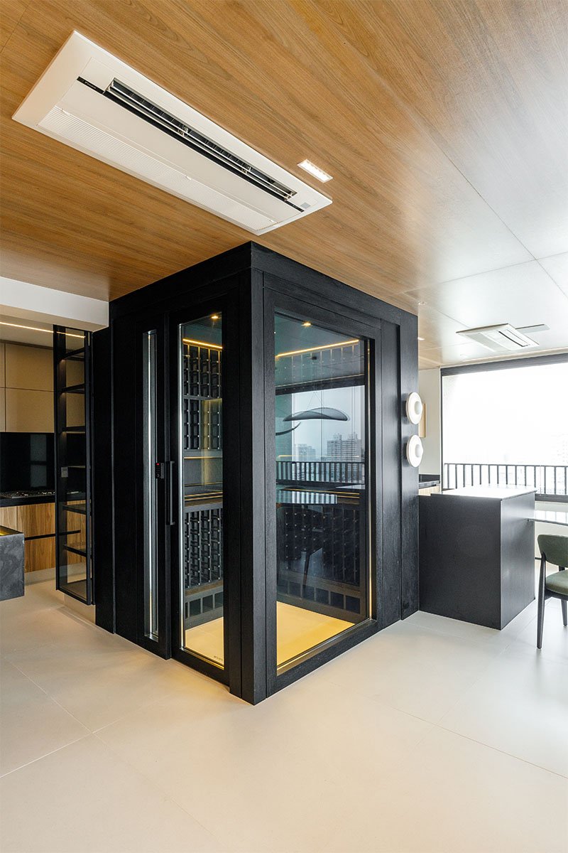 Apartamento sofisticado e acolhedor, com curvas, madeira e uma adega walk-in integrada aos ambientes, unindo funcionalidade e imponência.