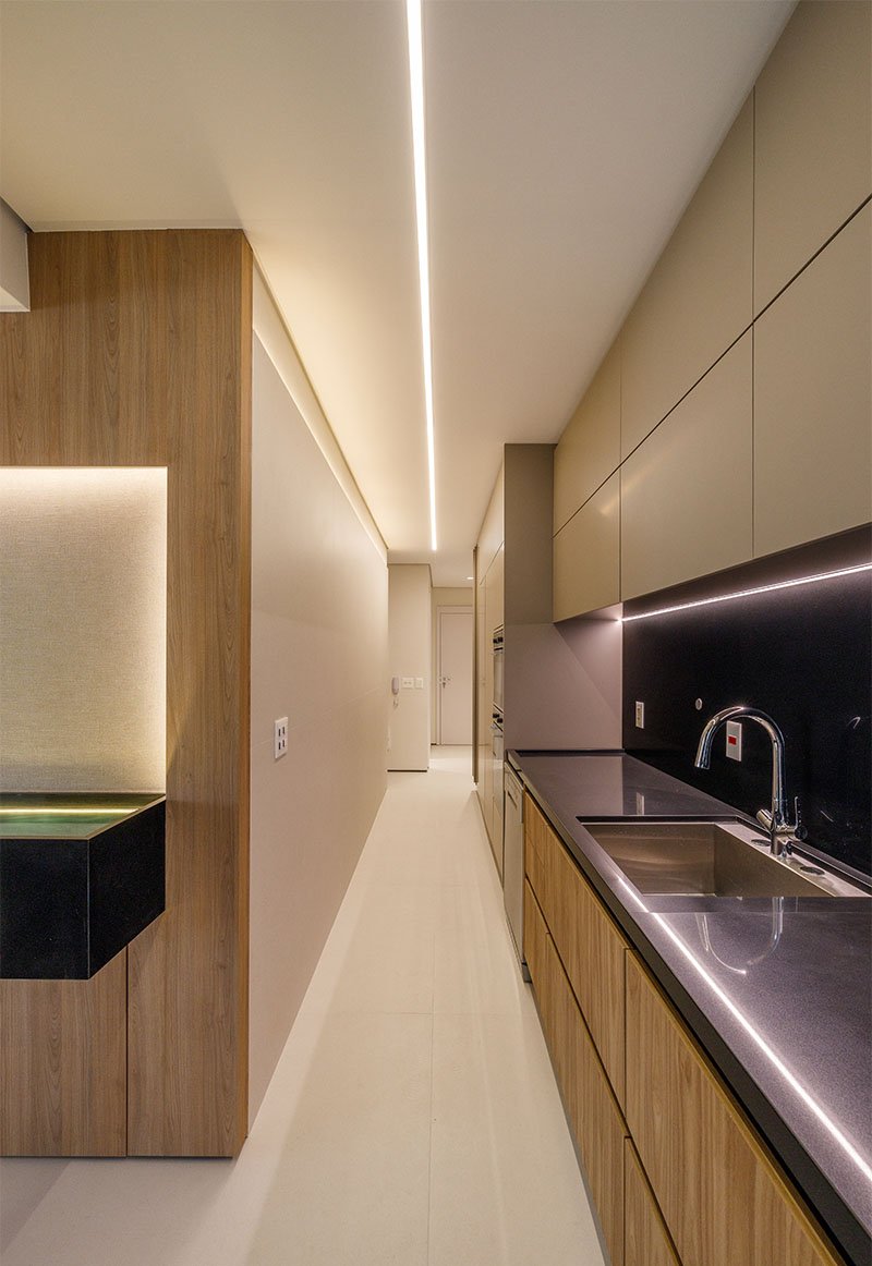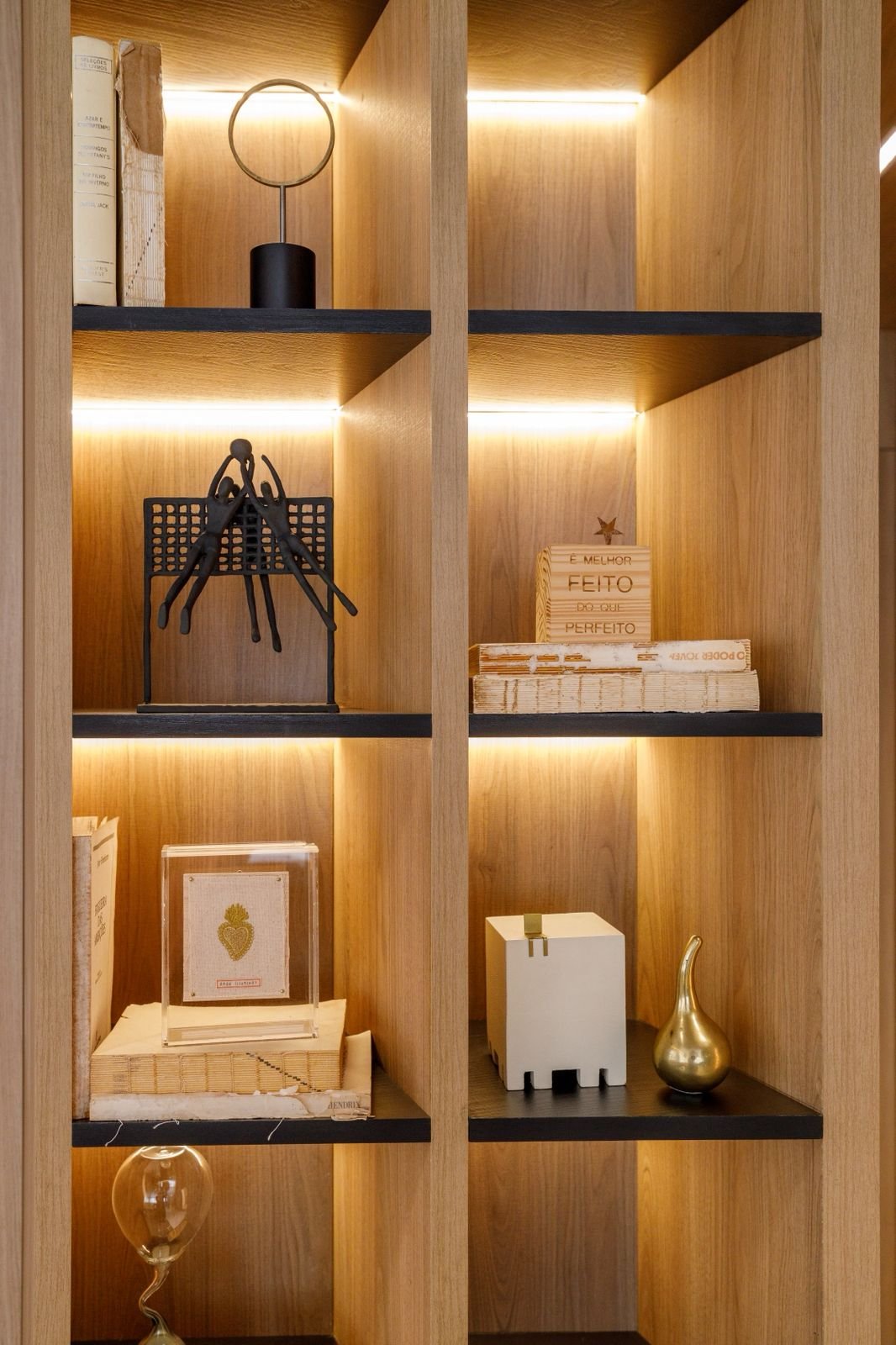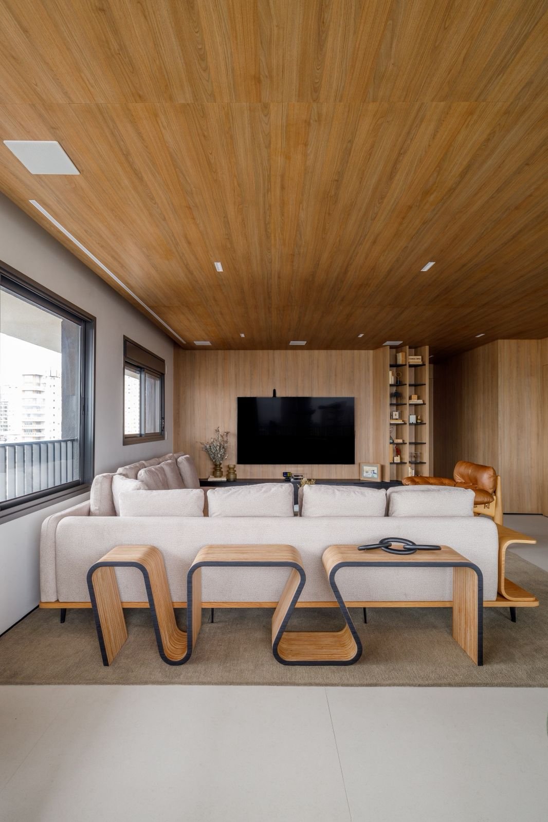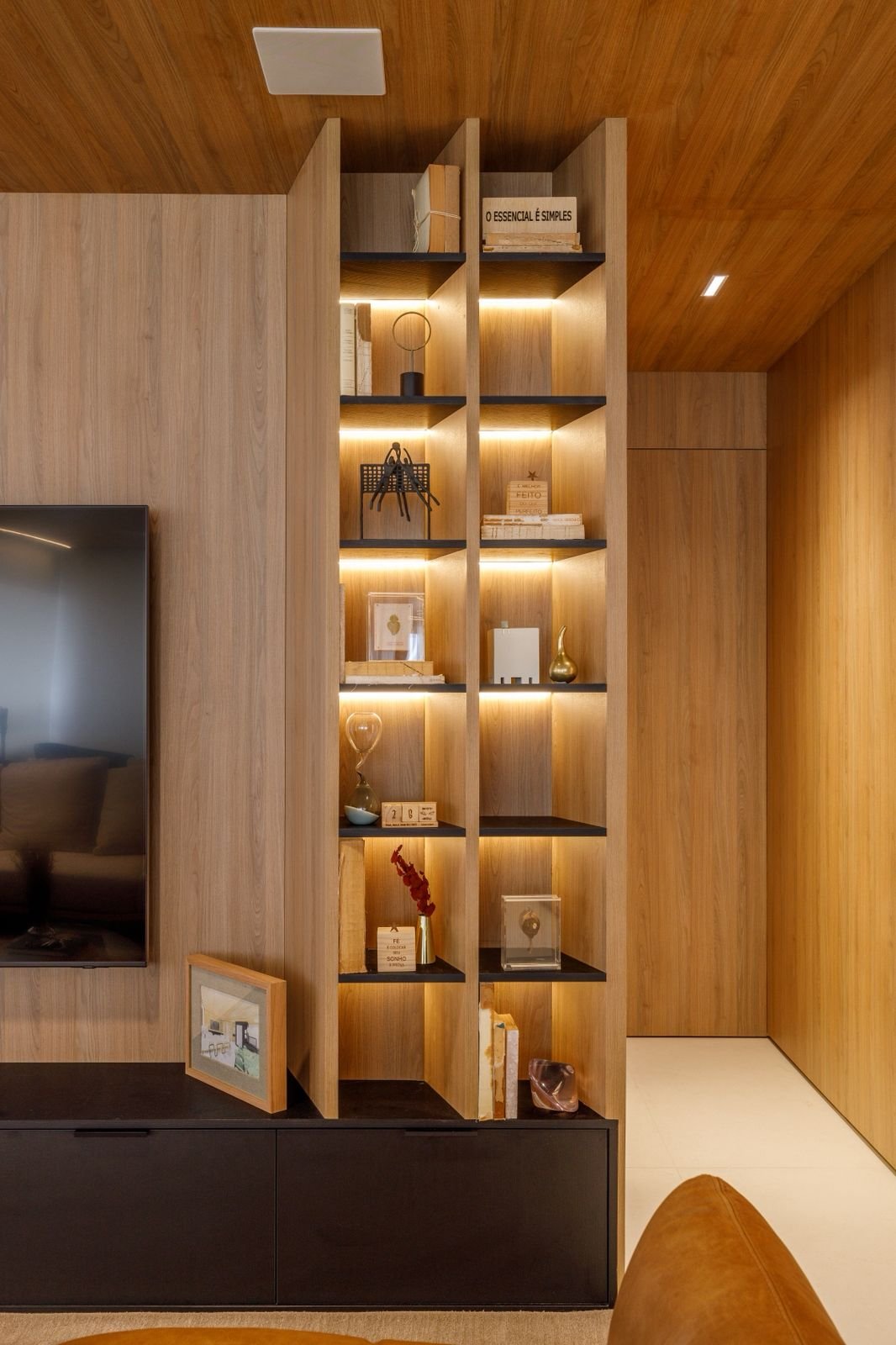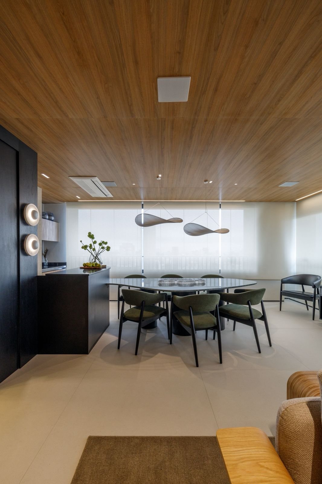 Apartamento sofisticado e acolhedor, com curvas, madeira e uma adega walk-in integrada aos ambientes, unindo funcionalidade e imponência.