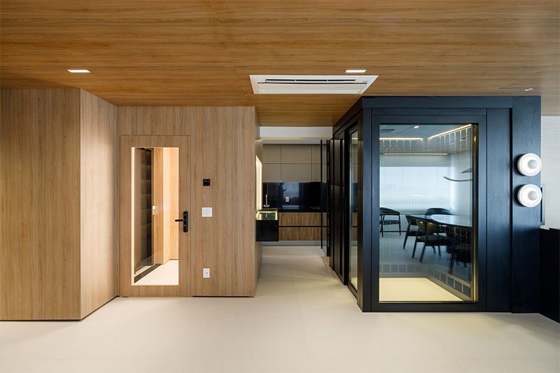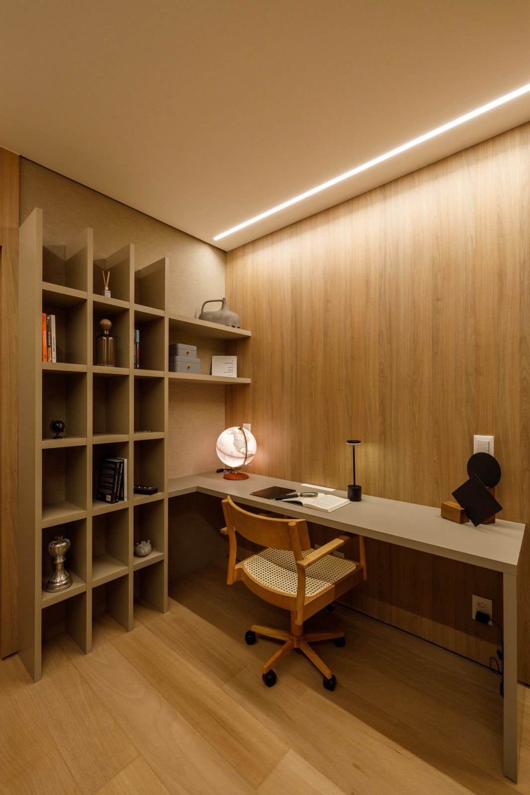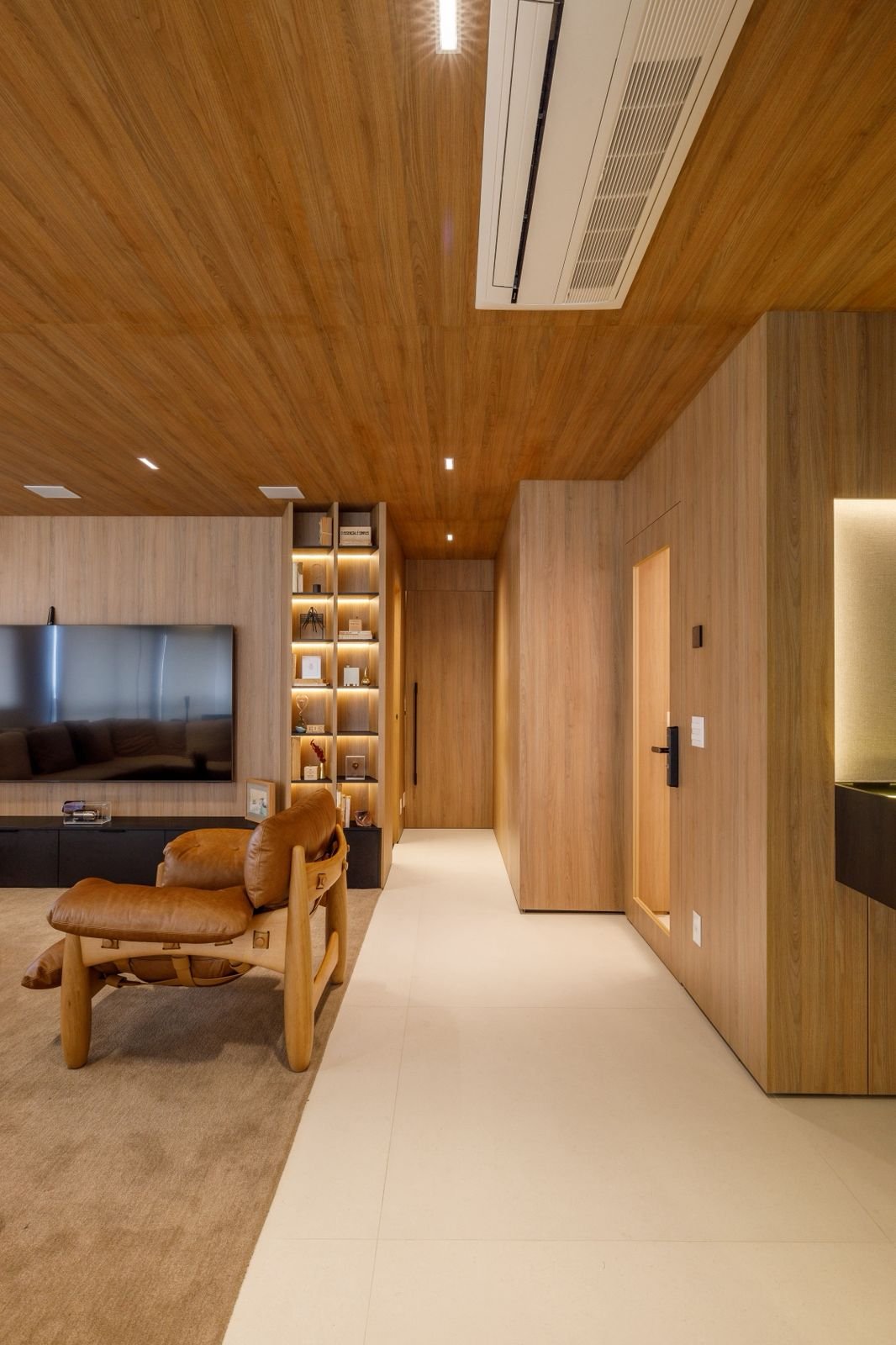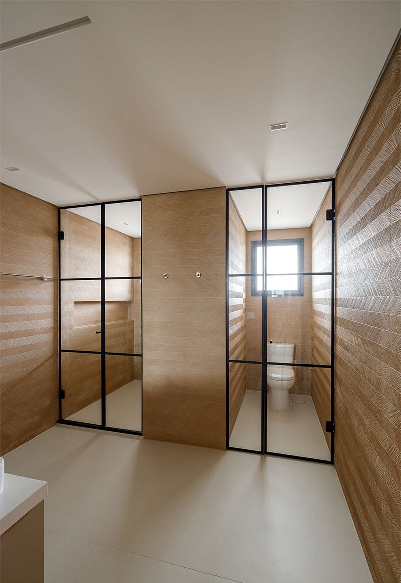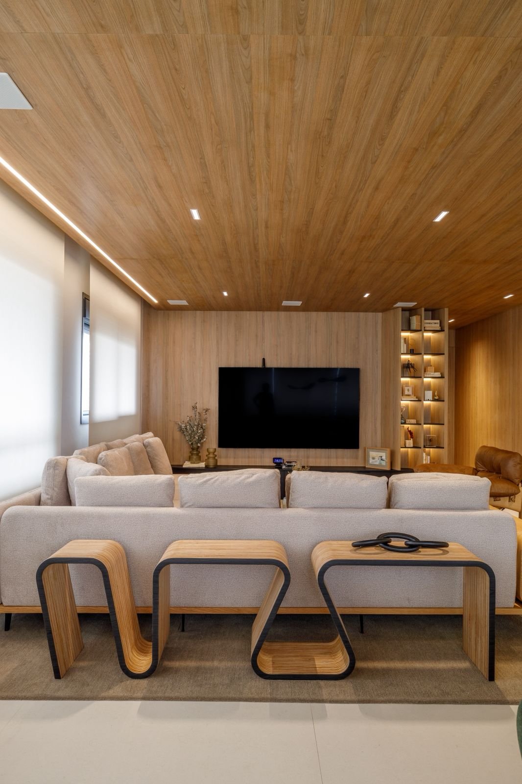 Projetado do zero, este apartamento traz uma linguagem sofisticada e marcante, com presença de curvas, cores elegantes e muita madeira. O forro amadeirado percorre os ambientes, reforçando a sensação de aconchego e continuidade visual. O grande destaque é a adega walk-in, que compõe o cenário da sala de estar e se integra de forma fluida aos espaços gourmet e à cozinha. Um projeto que une funcionalidade e imponência, com detalhes que impressionam em cada ângulo.