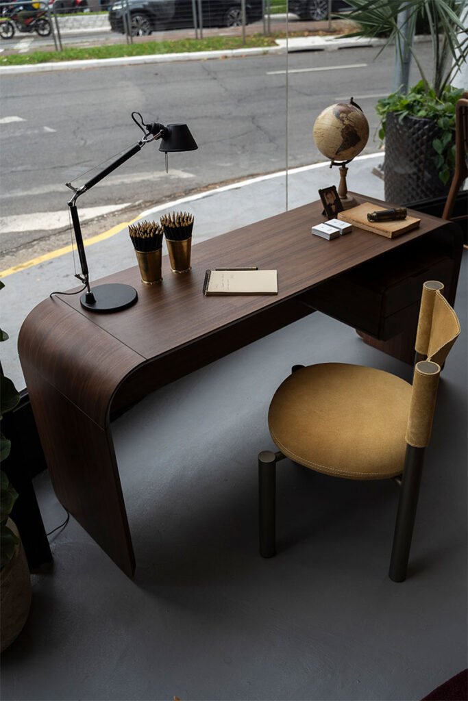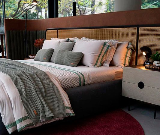 Criado para a mostra da loja Bed and Room, este quarto propõe mais do que um espaço de descanso: é um convite à introspecção e à criação. Com uma paleta de cores mais escuras, formas curvas e iluminação acolhedora, o ambiente traz uma escrivaninha com papéis e lápis como símbolo de que, a cada dia, escrevemos um novo capítulo da nossa história. Um refúgio sensorial, pensado para inspirar pausas, ideias e recomeços.